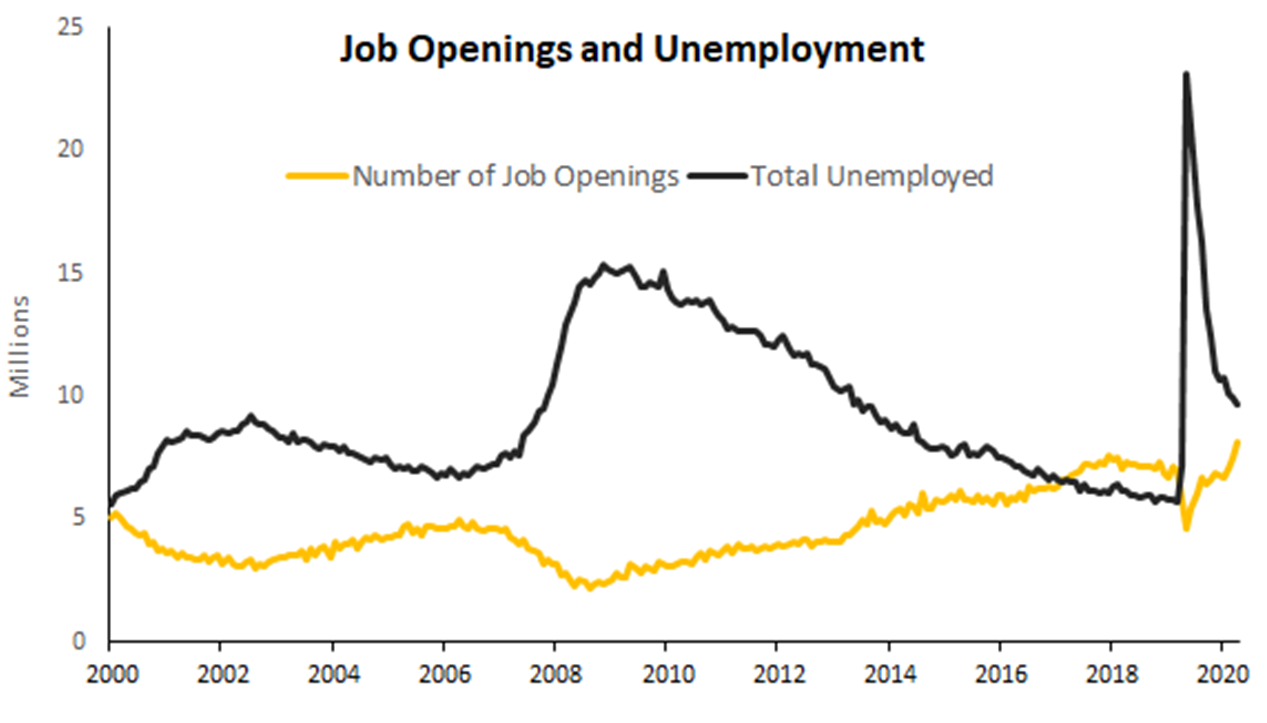 △ 미국 언론들은 연일 고용회복이 더딘 것이 추가 실업 급여 때문이라며 정부 정책에 문제를 제기 하고 있다. 몇십만불의 연봉을 받고, 공짜돈으로 호의호식하는 기득권의 이러한 프레임은 참으로 어의가 없다. 아래 그림을 보면 기업들의 구인난은 이미 2017년부터 시작되었다. 이것은 트럼프 행정부의 반이민 정책으로 저임금 노동자를 구하기 힘들기 때문이기도 하고 또한 고숙련 IT 기술자가 부족해서이기도 하다. 즉 미국 노동시장은 극단적으로 양끝에 있는 노동인력에 대한 공급이 부족하다. 트럼프 행정부 이후 반이민 정책이 누적되었고 2년간 코로나로 불법 체류자 조차도 줄어들어 나타나는 현상이다. 미국은 늘 이민을 통해 이를 해결해왔다. 자기들의 공짜돈은 괜찮고 어려운 사람들에게 주는 $300은 문제인가? 그것이 문제라면 자신들의 연봉과 노동량에 대해 공개해보길 바란다.