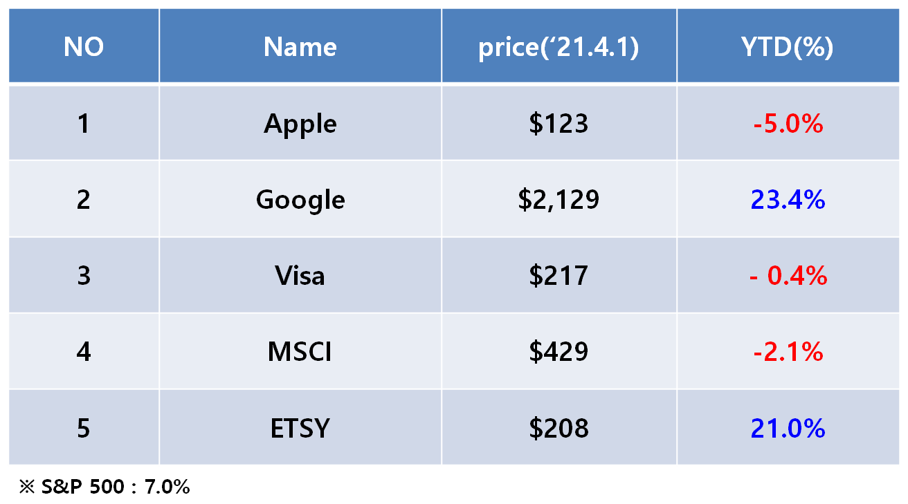 7. 쿠팡(CPNG) : JP Morgan은 쿠팡에 대해 향후 수년간 한국 전자상거래 시장에서 점유율을 확대할 것이라고 전망. 코로나 19 상황에서 동사는 총 거래액이 14% 증가했으며 25년까지 연평균 31%의 총 거래액 증가세가 나타날 것으로 예상. 목표주가 →$48