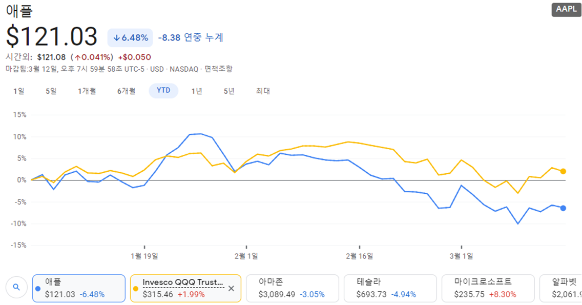 △  작년 한해 100% 넘게 상승했던 애플이 올해는 힘을 쓰지 못하고 있다.  나스닥 ETF QQQ가 올해 약 2%  상승한 반면 애플은 6% 넘게 하락중이다.  그러나 애플 주가의 이러한 횡보는 아주 좋은 매수 기회라고 생각한다. 애플은 올해 맥북에 자체 개발한 M1칩을 사용하면서 수익성 및 성능 향상을 위한 매우 중요한 발걸음을 시작했다. 또한 에어팟3와 에어태그라는 신제품을 준비하고 있으며 무엇보다 서비스 매출이 급격하게 늘어나고 있다. 전체 매출 증가세가 높지 않더라도 고부가가치 상품 증가 및 원가 절감을 통해 이익이 빠른 속도로 늘어날 수 있는 체질개선에 박차를 가하고 있는 것이다.  애플의 이러한 노력은 5G로 변환하는 시점에 아이폰 판매량 증가와 맞물려 애플의 기업 가치를 훨씬 높일 것이라고 확신한다. 애플은 반드시 가지고 가야하는 종목이다.