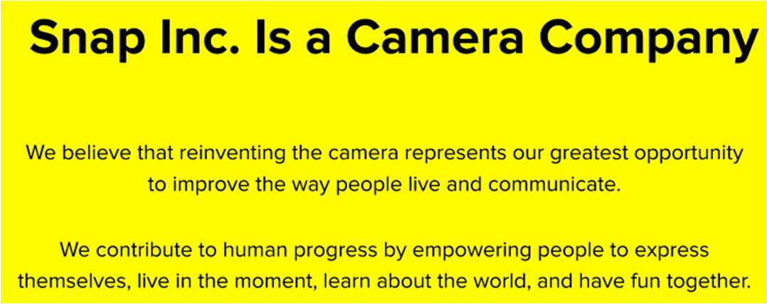 미국 젊은이들 사이에서 가장 인기가 높은 스냅챗의 모회사 스냅은 기존 SNS의 통념을 깨는 약간은 삐딱한 기업이다. 카카오톡이나 위챗, 왓츠앱 처럼 친구간에 커뮤니케이션 기능이 중심인 이 회사는 특이하게도 자신들을 카메라 회사라고 소개하고 있다. 스냅챗은 이름처럼 어떤 대화내용도 기록으로 남기지 않는다. 그 순간 순간을 친구와 공유하고 모든 대화 내용은 자동으로 삭제된다.