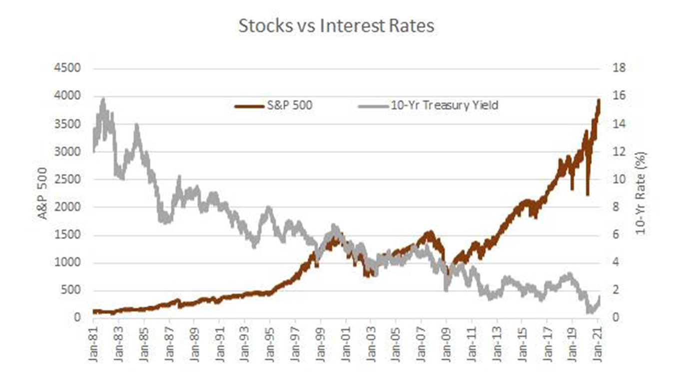 △ 주식시장을 설명하는 여러가지 가운데 가장 중요한 것은 역시 금리이다. 지난 40년간 10년물 국채금리는 16% 에서 0%까지 떨어졌다. 반면 S&P500 지수는 100에서 3,900까지 약 40배 상승하였다. 정확히 역의 관계에 있는 것이다. 이것은 겉으로 보이는 표면적인 것이다. 자본주의는 어짜피 돈이 늘어나지 않으면 성장할 수 없다. 돈이 흔해지니 돈 값(이자율)이 떨어지는 것은 당연하다. 그만큼 경제는 성장했고 이윤추구를 목적으로 하는 전문가 집단인 기업은 그 상황에서 가장 큰 돈을 벌어들였다. 그 기업의 성과를 공유한 사람은 부자가 되었고 그렇지 못한 사람은 돈 값의 하락으로 상대적으로 가난해졌다. 내가 아래 그래프에서 주목하는 부분은 금융위기 이후 오히려 주가 상승이 과거보다 덜해지고 있다는 사실이다. 1981년부터 2000년 초반 닷컴버블 붕괴전까지 주가는 약 15배 상승하였다. 하지만 그 이후 S&P 500 지수는 10년간 횡보하였고 금융위기 이후 2배가 되기까지 20년이 걸렸다. 우리가 미국 주식시장이 많이 상승하였다고는 하지만 과거 금리가 높았던 시기보다 훨씬 덜 상승하고 있다. 이것은 역대급으로 많이 풀린 돈이 선순환(투자-소비-투자)을 만들어내지 못하고 있어 기업들의 성장세가 과거만큼 높지 않다는 것을 의미한다. 몇몇 기술 기업을 제외하고는 성장의 속도가 현격하게 느려졌다. 아무리 돈을 많이 풀어도 과거처럼 인구가 폭발적으로 늘어나지 않는다면 인간 삶의 필수품 가격은 오르기 어려워 보인다. 반면 늘어난 유동성은 예전에 없던 소비를 늘리고 있고 앞으로 늘릴 것이다. 온라인으로 음악을 듣고 드라마를 보고 친구들과 게임을 하고 아이템을 구매하고 클라우드로 일을 하고 때때로 쇼핑을 즐길 것이다. 새로풀린 돈은 오프라인 세상에 머물지 않는다. 우리가 매일 만나는 브라우저 넘어에 존재하는 새로운 세상에 풀릴 것이다. 우리는 2개의 세계에 살고 있기 때문이다.
