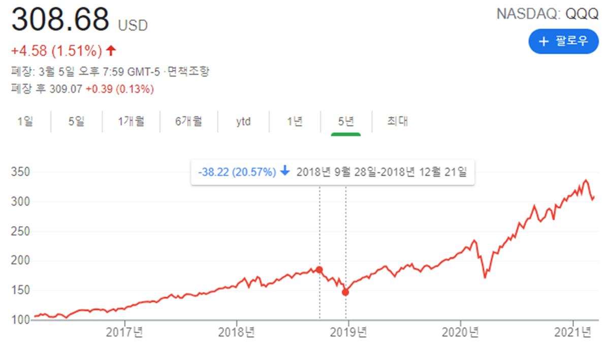 △ 아래 그림은 나스닥 100지수를 추종하는 QQQ의 지난 5년간의 차트이다. 개인적으로 2018년 10~12월 사이에 지루한 하락장이 생각나는 요즘이다. 당시에 연준의 지속적인 금리인상으로 시장이 발작을 일으켰던 시기이다. 3개월 사이에 약 20% 하락했었는데 이후 5개월만에 모두 만회하였다. 당시 기업들의 주주환원 및 실적은 역대 최고치였다. 그럼에도 연준이 금리인상에 브레이크를 걸지 않자 주가가 폭락한 것이다. 시장이 20% 하락하면 왠만한 종목은 30% 이상 빠진다고 보면된다. 몇년동안 오른 수익이 불과 1달 사이에 없어진 경험이 아직도 뇌리에 선하다. 주식시장은 항상 그런식이다. 그래서 늘 겸손하게 만든다. 과거의 경험상 이번 조정은 아직 끝나지 않았다. 연준의 우호적인 발언과 다음달 시작되는 기업들의 서프라이즈가 있어야만 다시 방향을 잡을 것이다. 그때까지 좋은 기회이다. 나스닥이 연간으로 마이너스로 전환하면 분할해서 매수하기 좋은 타이밍이라 생각한다. QQQ에 투자하는 것이 가장 안전하다.