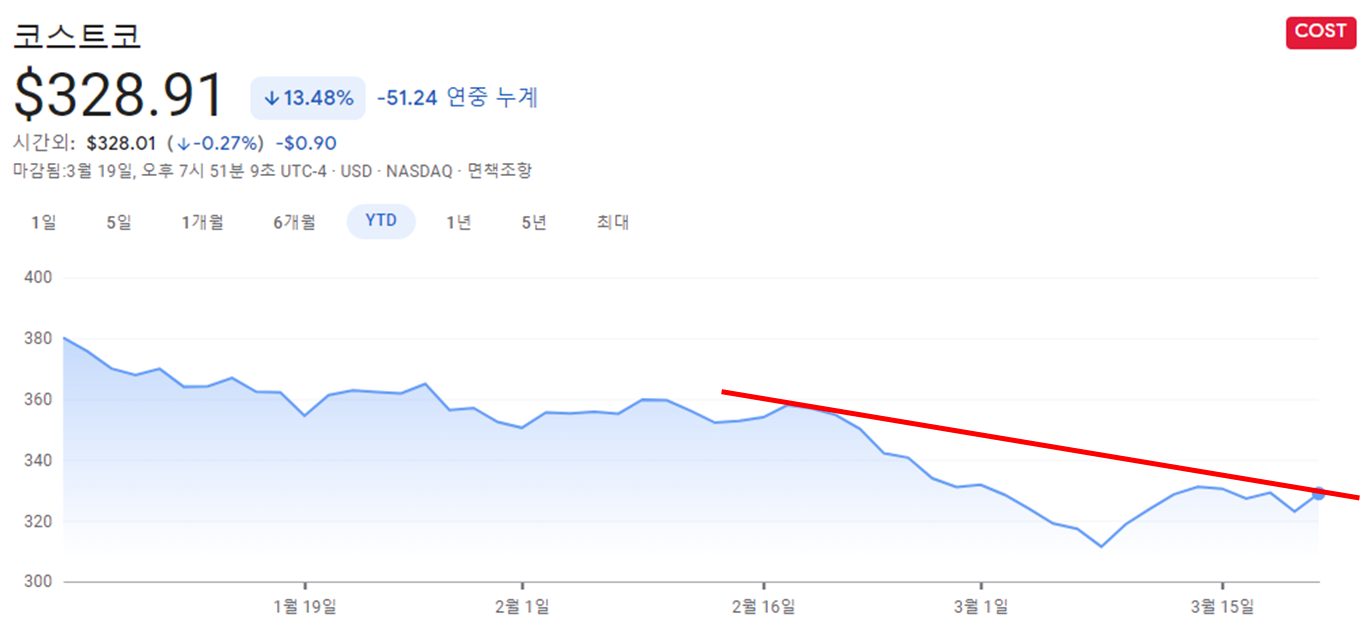 팬데믹으로 인해 필수품 사재기가 벌어지면서 작년 실적이 좋았던 코스트코는 백신의 보급으로 일상생활로의 복귀가 가까워지자 실적 하락 우려감에 주가가 하락하였다. 또한 워낙 직원들에게 좋은 회사라 임금 인상 및 복지 비용 지출이 늘고 있어 시장에서는 이에 대해서도 우려하고 있는 것으로 보인다. 그럼에도 불구하고 북미에 살고 계신 분이라면 최근 코스트코를 방문해보셨을거라 생각한다. 그야말로 인산인해다. 주말에 많은 것은 당연하고 평일에도 아주 가끔 한산하고 항상 사람이 많다. 또한 팬데믹을 계기로 배송서비스를 더욱 강화하고 있어 매출 상승 시간문제라고 생각한다. 온라인 서비스의 확장, 지속적인 신규 점포 건설, 팬데믹 종료에 따른 주유소 매출 정상화 등이 향후 코스트코 실적을 견인할 것이며 코스트코의 수백만 충성고객은 앞으로도 지속적으로 회원 갱신을 할 것이라 확신한다. 장기적으로 반드시 투자해야하는 기업이다.