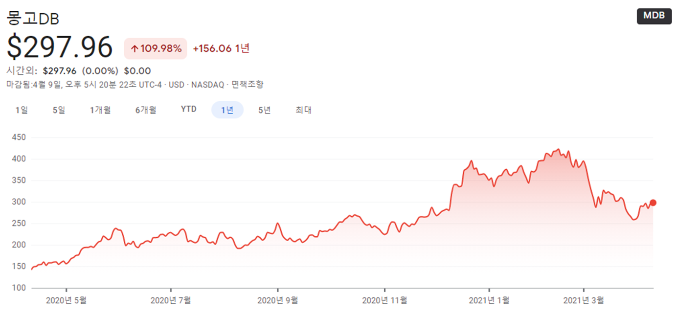 △ 이번주 소개할 미국 주식은 몽고DB라는 미국 클라우드 회사이다. 시가총액 20조 규모로 비교적 작은(?) 기업이지만 지난 수년간 매출이 3배 증가할 정도로 성장세가 가파르다. 아직 적자를 기록하고 있지만 머지않아 흑자 전환이 예상되는 기업으로 최근 주가가 조정을 받아 꽤 괜찮은 진입시점이 만들어졌다. 데이터베이스 시장은 SQL을 활용한 관계형 데이터베이스가 대부분이고 여기서 주도기업은 오라클이었다. 하지만 몽고DB가 출현하면서 새로운 대안이 제시되고 있다. (비관계형) 지난 1년간 109% 상승하였지만 앞으로 성장 가능성이 큰 기업으로 보인다.